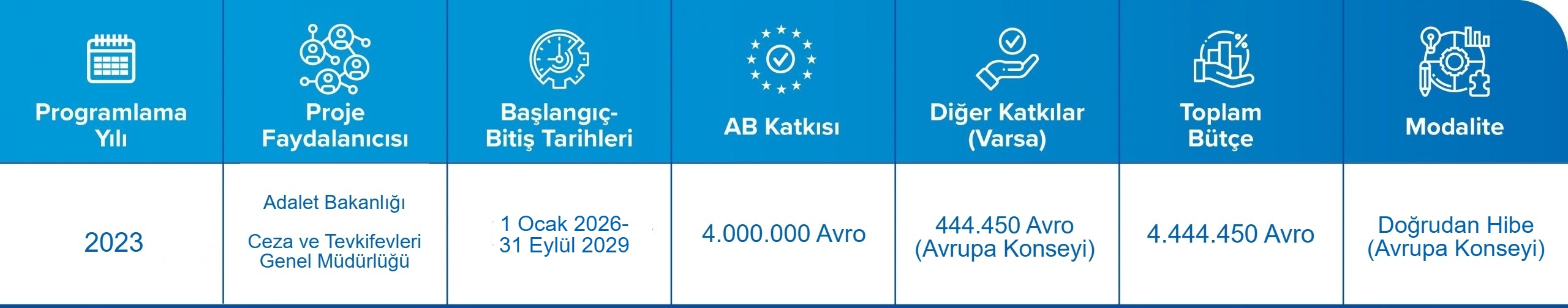 Proje kapsamında, Türkiye’deki kadın mahkûmların cezaevi koşullarının, uluslararası standartlar ve AB’nin iyi uygulamalarına uygun olarak, cinsiyete duyarlı ve insan haklarına dayalı cezaevi yönetimi politika ve uygulamaları yoluyla iyileştirilmesi ve Türkiye’de kadın mahkumlar ile denetimli serbestlik altında olan kadınların topluma yeniden entegrasyonlarını kolaylaştırmak amacıyla ekonomik ve sosyal rehabilitasyonlarının güçlendirilmesi (döngünün kırılması) hedeflenmektedir.
